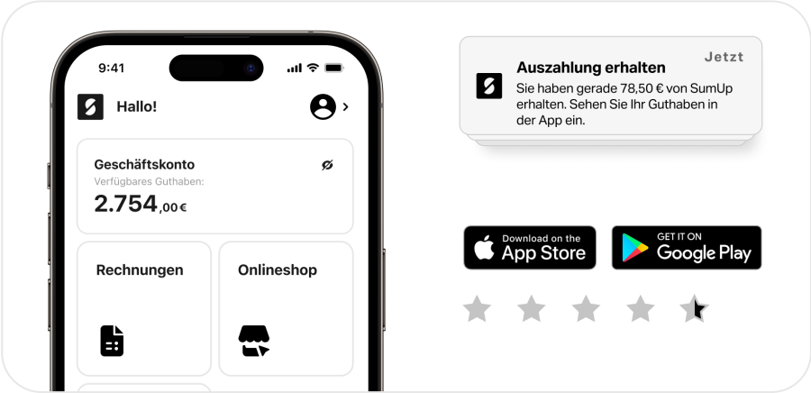 Laden Sie einfach die kostenlose SumUp App aus dem Apple App Store oder bei Google Play herunter, um sofort Zugriff auf unsere Geschäftslösungen zu erhalten.
