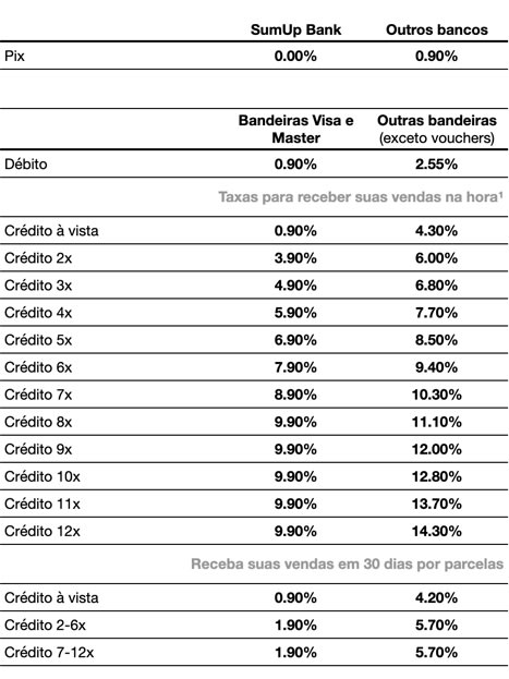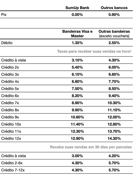 ¹O plano de recebimento “Instantâneo” é válido apenas para novos clientes SumUp Bank. Sujeito à análise e aprovação com liberação prevista para até 2 dias úteis. Para clientes não-SumUp Bank ou em análise, o prazo de recebimento é de 1 dia útil.